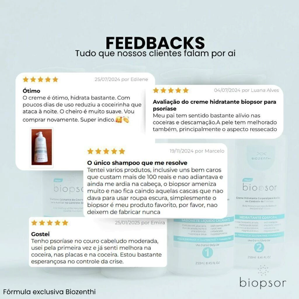 Enriquecido com ativos como Aloe Vera, Óleo de Rosa Mosqueta, Piritionato de Zinco, Extratos de Arruda e Alecrim, o Biopsor promove limpeza suave, ação calmante, regeneração cutânea e hidratação profunda. Sua composição respeita a barreira natural da pele e ajuda a reduzir descamação, coceira e vermelhidão, sintomas comuns da psoríase.