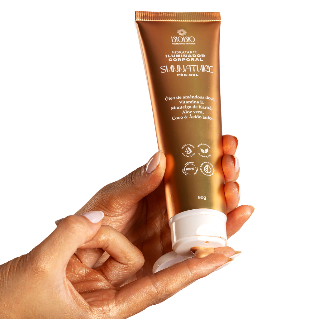 O Iluminador Corporal Hidratante e Pós-Sol Sunnature, da BioBio, oferece um cuidado completo para a pele: hidratação profunda, alívio após a exposição ao sol e um brilho radiante que realça o tom natural.