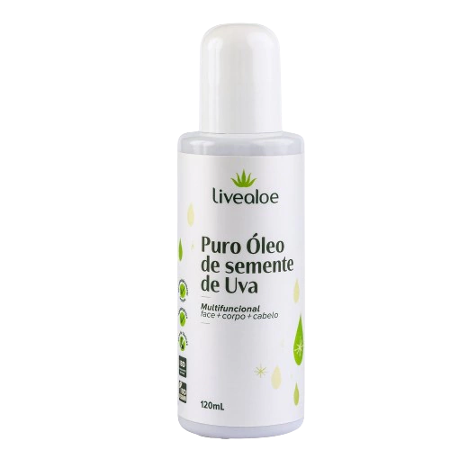 O Puro Óleo de Semente de Uva 120ml LiveAloe é um óleo vegetal leve e natural, ideal para cuidados de beleza da pele e dos cabelos.